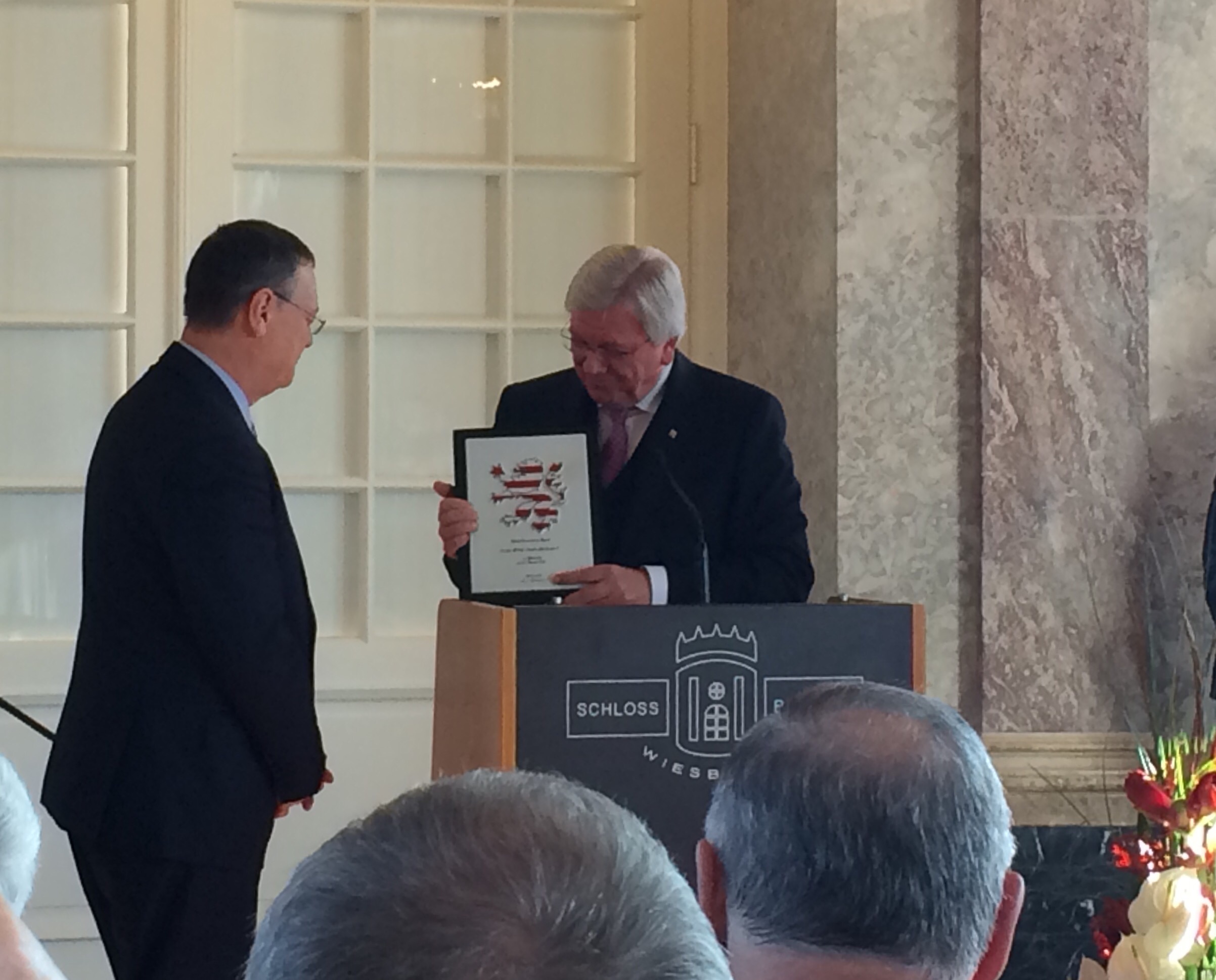 Sein Sohn Avshalom Weinstein nahm die Ehrung für seinen erkrankten Vater entgegen. Er dankte: „Jedes Konzert zu dem ich die Geigen mitbringe ist ein Denkmal für die ehemaligen Besitzer. Bis heute sehe ich vor meinem inneren Auge die Klezmer-Musiker, die uns zu Hause besuchten und ohne Noten spielten. Schon 1936 wurden jüdische Musiker aus Orchestern ausgeschlossen. Die meisten ihrer Geigen waren von deutschen Geigenbauern aus Mittenwald und Berlin gebaut worden. Ein berühmter Geiger kam zu meinem Vater und drohte, wenn Du mir die von einem Deutschen gebaute Geige nicht abkaufst, zerbreche ich sie. Mein Vater kaufte alle Geigen ab. Heute, 70 Jahre nach Ende des Krieges, sind die Geigen noch bei uns in der Werkstatt. 60 Geigen haben Ihren Weg zu uns gefunden. Ihre Klänge hallen wider und erreichen Zigtausende durch Konzerte, über das Fernsehen und den Rundfunk“. In den kommenden Monaten sind Konzerte in Washington, Cleveland, Alabama geplant und und eine Geigenausstellung. Beim anschließenden Empfang tauschten Weinstein, Bouffier und die vielen Ehrengäste freundliche Gedanken und Erinnerungen aus.