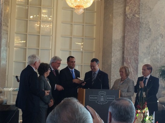 Wiesbaden, 30. Oktober 2016 – Bei strahlendem Sonnenschein fand heute – unbeeindruckt von der Demo in der City – im Biebricher Schloss ein besonderer Festakt statt. Gefeiert wurde das 50-jährige Gründungsjubiläum der Deutsch-Israelischen Gesellschaft e.V. und die Verleihung der Ernst-Cramer-Medaille an Amnon Weinstein aus Israel, den weltbekannten Restaurator der Violinen ehemaliger KZ-Häftlinge. Nach Klängen von Vivaldi begrüßte Hellmut Königshaus (66), der Präsident der Deutsch-Israelischen Gesellschaft e.V. (DIG), den Hessischen Ministerpräsidenten und Gastgeber des Festaktes Volker Bouffier (64) und die zahlreichen Ehrengäste und erklärte das Ziel der DIG: „Wir setzen uns für das Existenzrecht Israels ein“.