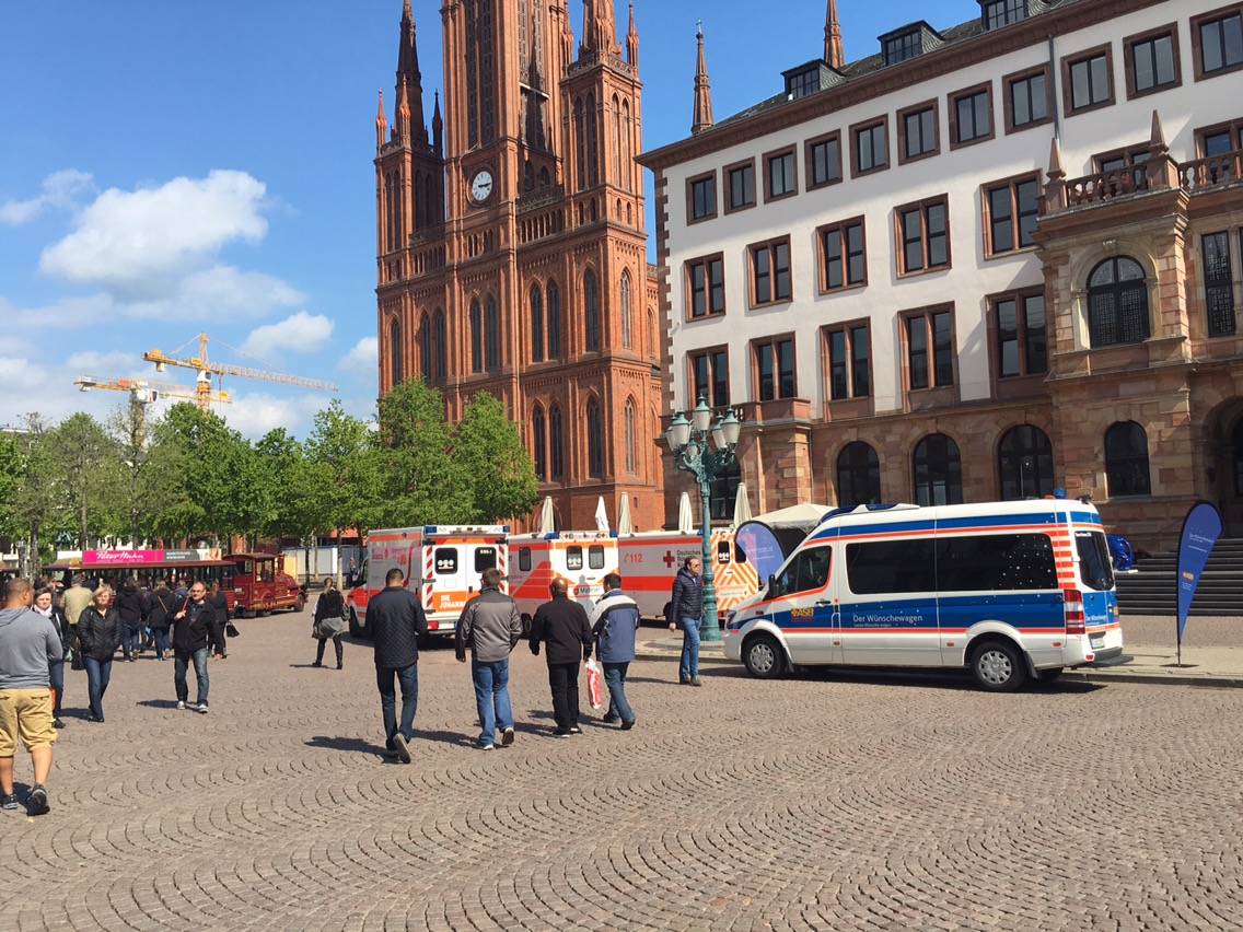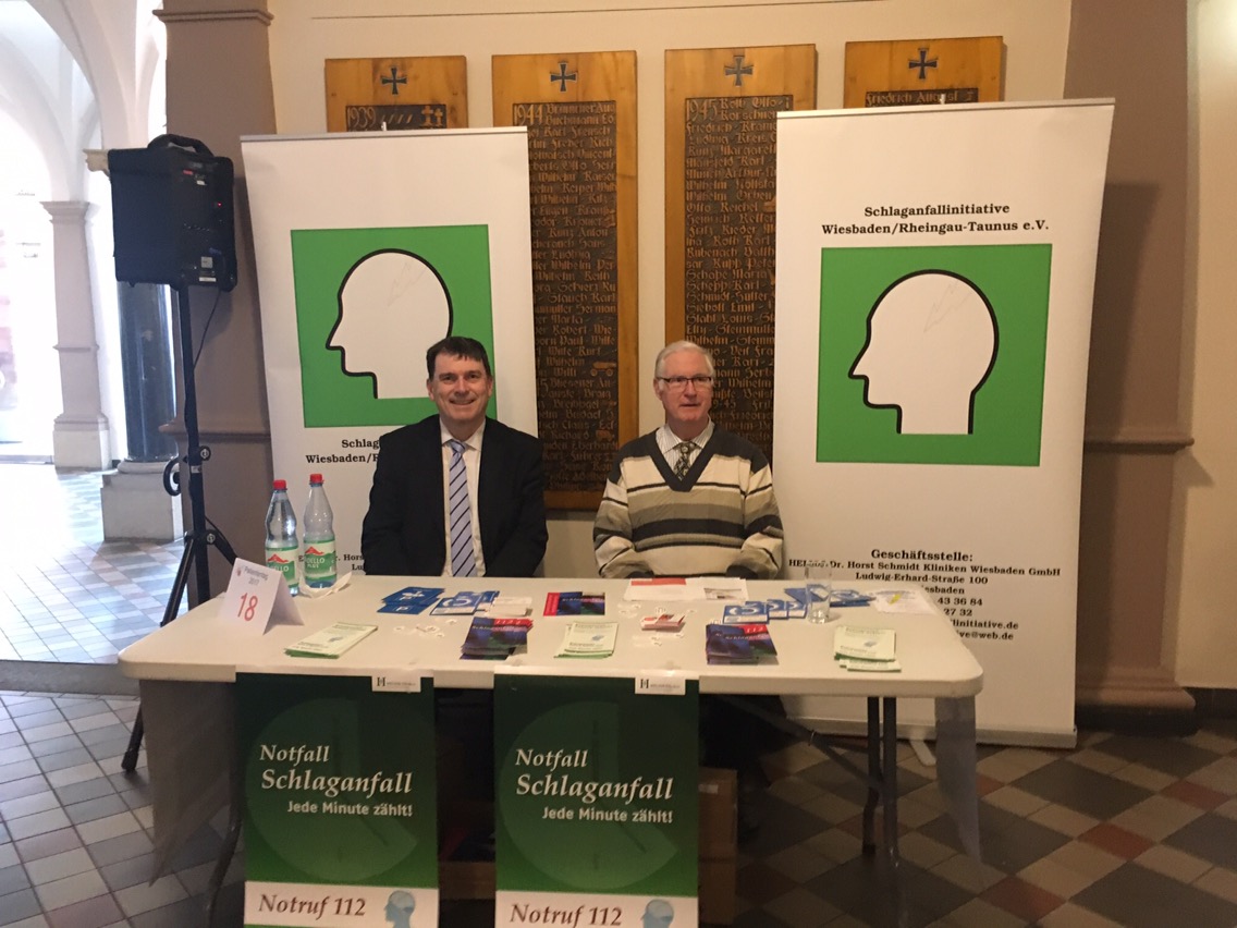 Ihr Vorsitzender Dr. Reinhard Völker (56, Arzt, Foto l.) erklärte: „Wir freuen uns über großen Besucherandrang am Stand. Es ist wichtig, einen Schlaganfall rechtzeitig zu erkennen und schnellstmöglich einer Therapie zuzuführen. Herabhängende Mundwinkel, halbseitige Lähmungen und Sprachstörungen sind die häufigsten Symptome“. Nächste Aktion am 3. Mai auf dem Schlossplatz: Das St. Josefs-Hospital Wiesbaden klärt von 10 bis 16 Uhr in einem roten englischen Doppeldeckerbus zum Thema Schlaganfall und Diabetes auf und bietet kostenlose Tests an (alle Details online hier – klick).