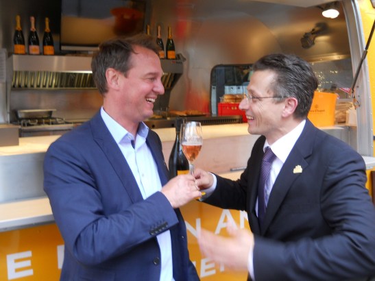 Nassauer Hof Hotel Manager Thorsten Sander (r.) und Florian Braun (Moet Hennessy) trinken Veuve Clicquot Grande Dame – das mit Abstand teuerste Getränk auf dem Fest. Die Flasche 0,75 l gibt es vor der Ente zum Sonderpreis von 130 Euro.