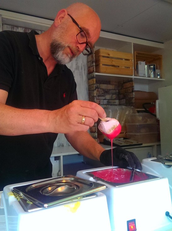 Robert Ackermann bietet eine Süßspeise mit handgemachten Marshmallows an. Name: Mellow Monkey, die Portion für 6 Euro.